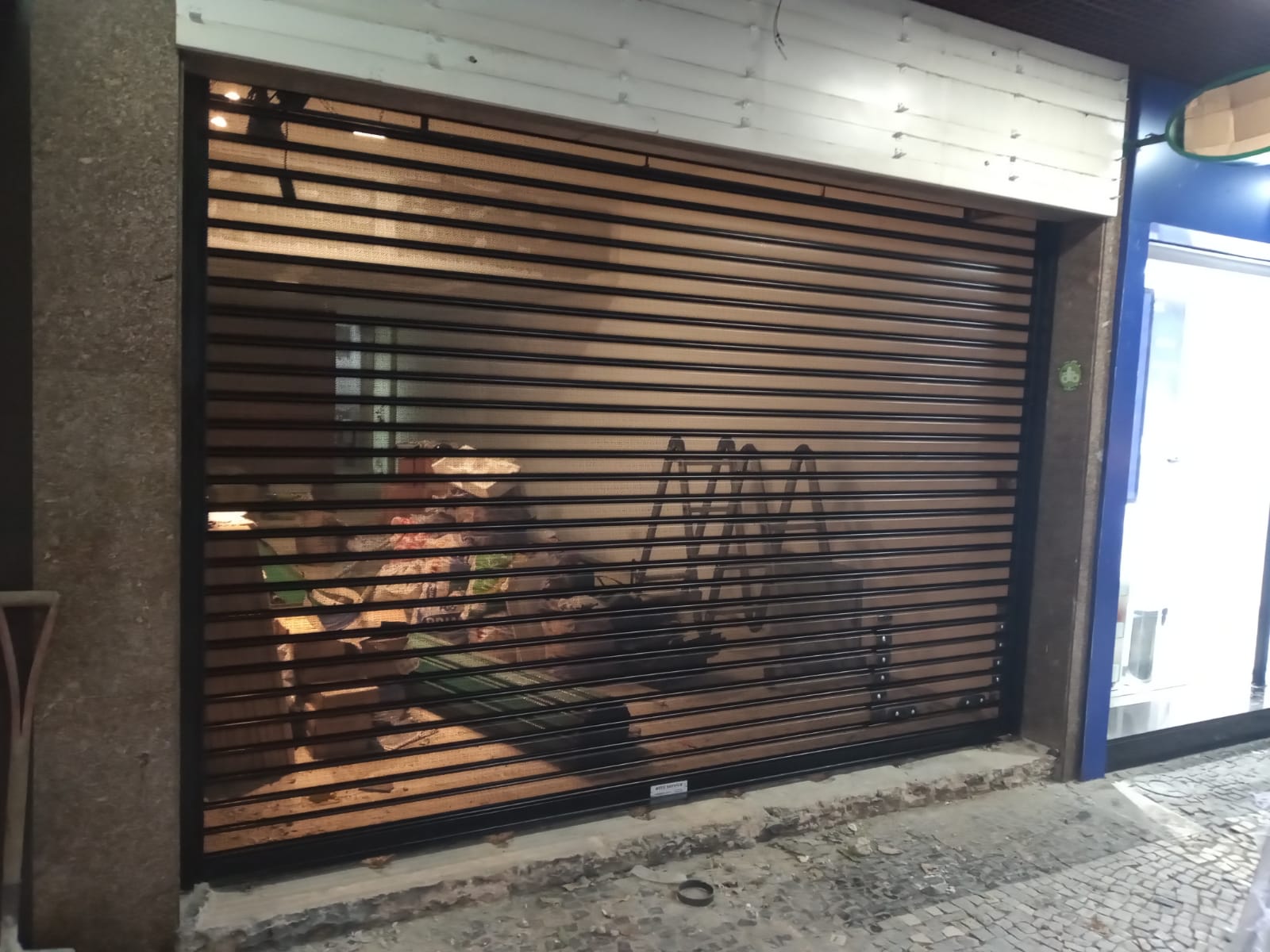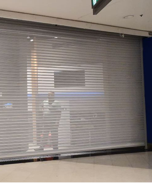 Modelo perfurado que permite visibilidade e ventilação, muito usado em shoppings, galerias e lojas de alto padrão, unindo proteção e exposição de produtos.